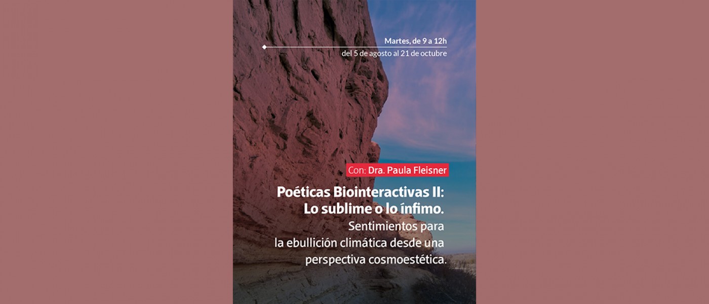 Poéticas Biointeractivas II. Lo sublime o lo ínfimo. Sentimientos para la ebullición climática desde una perspectiva cosmoestética. Con Dra. Paula Fleisner. En el marco de una cosmoestética que piensa una aísthesis y una póiesis adecuadas al presente y que parte del descentramiento de lo humano propuesto por los posthumanismos críticos y de una versión del materialismo que imagina ritmos diversos de existencia, en este seminario proponemos historizar el concepto de lo sublime y conceptualizar el de lo ínfimo para dar cuenta de los sentimientos que aún hoy nos permiten pensar otras relaciones más que humanas entre arte y naturaleza, y entre estética y política. Si bien el seminario es eminentemente filosófico, se propondrá a lxs estudiantes trabajar textos y materiales artísticos que habiliten una reflexión acerca de las declinaciones de lo sublime en el arte contemporáneo, así como de las posibles apariciones de una estética de lo ínfimo.