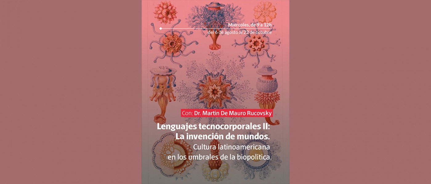 Lenguajes tecnocorporales II: La invención de mundos. Cultura latinoamericana en los umbrales de la biopolítica. Con Dr. Martin De Mauro Rucovsky. El presente seminario aspira a situar algunas conversaciones a partir del diálogo entre materiales filosóficos y teóricos e intervenciones estéticas y culturales en América Latina que giran en torno a la porosidad que atraviesa oposiciones fundacionales de las humanidades y del modernismo desarrollista (trabajo/pobreza, naturaleza/cultura, vivo/inerte, etc). El objetivo principal es analizar el cruce del pensamiento biopolítico, las reflexiones recientes sobre precariedad y las discusiones en torno al antropoceno que atraviesan las tradiciones estéticas, los vocabularios activistas y las apuestas críticas. Una zona de indagación expansiva en torno a lo viviente y los mecanismos específicos de poder (biopolítica) que refiere a una vida, el ser vivo o el viviente y en cuyo centro magnético se descubre la importancia de una vida corporal allí, donde las condiciones para su sostenimiento no están dadas, o en la imposibilidad de garantizar la permanencia corporal en el tiempo (precariedad).