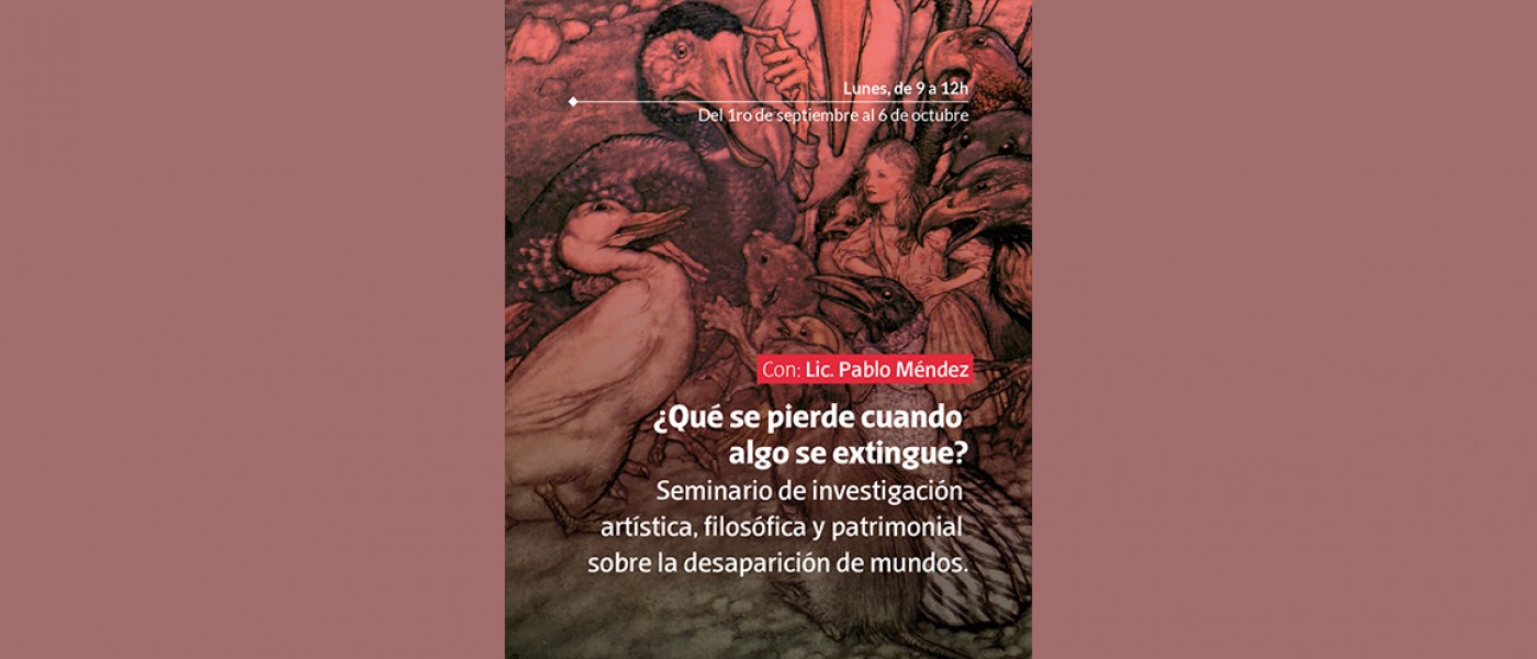 ¿Qué se pierde cuando algo se extingue? Seminario de investigación artística, filosófica y patrimonial sobre la desaparición de mundos. Con Pablo Mendez. Este seminario se propone abordar la extinción no como un hecho natural ni como una simple desaparición biológica, sino como una problemática compleja que atraviesa lo sensible, lo patrimonial, lo simbólico, lo político, lo inconsciente y lo ontológico. Nos preguntamos: ¿qué desaparece cuando desaparece una especie? ¿Qué formas de mundo se pierden cuando ya no hay quien las habite, las cante o las huela? ¿Cómo pensar y sentir esa pérdida desde la práctica artística contemporánea? Este seminario propone una constelación de textos seleccionados y traducidos especialmente para la ocasión, construyendo una bibliografía viva y situada, atravesada por las artes, la filosofía contemporánea, el psicoanálisis, las humanidades ambientales y los estudios patrimoniales. La metodología será teórico-práctica, crítica y afectiva, abierta a quienes deseen explorar otras formas de preguntar, sentir y hacer frente a la extinción.