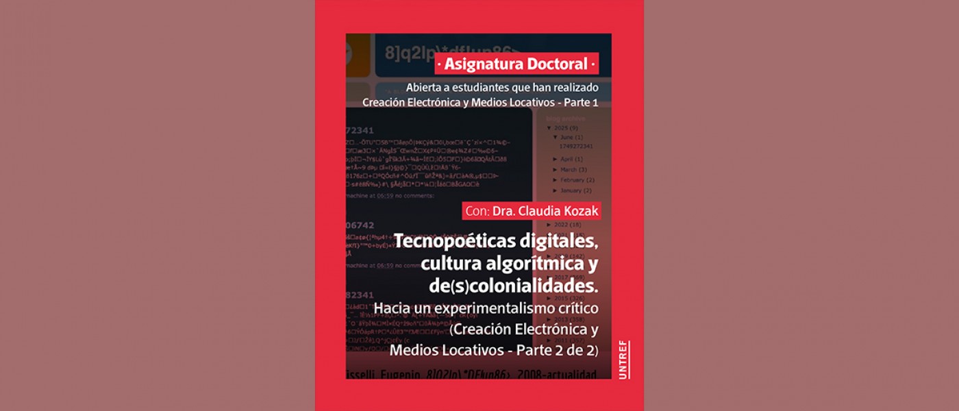 Lenguajes tecnocorporales expandidos. Con Dra. Alejandra Ceriani. Este seminario propone estudiar una serie de tópicos relacionados con la corporalidad, el contexto de las prácticas artísticas hibridas y la estética de las artes electrónico digitales. Se destacará la emigración del cuerpo performático al contexto mediatizado por las tecnologías de cada momento. En vista de las características particulares de las experiencias de producción multimedia, se observará cómo se afectan y mutan la gestualidad estetizada, la percepción sensible y la comprensión de la corporalidad por medio de diversas materialidades digitales y virtuales. Entendemos a la tecnología como un conjunto de tensiones y fuerzas activas que se ejercen a través de determinados procedimientos y relaciones; por tanto, no podemos reducir su accionar sólo a niveles instrumentales. De igual forma, el concepto de corporalidad conlleva el conocimiento inmediato de nuestro cuerpo en función de la interrelación con el contexto mediato que nos amplía, proyecta y modifica.